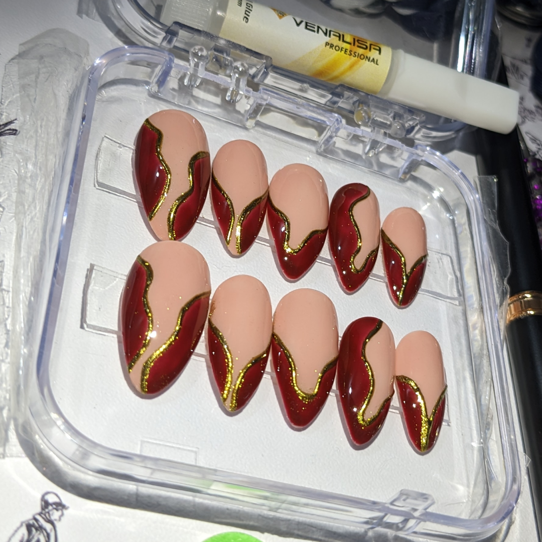 Glow with glamour! These Peach and Red Press On Nails with a golden chrome finish add a royal touch to your look — elegant, reusable, and easy to apply for instant salon perfection.
